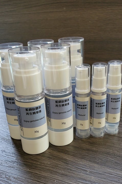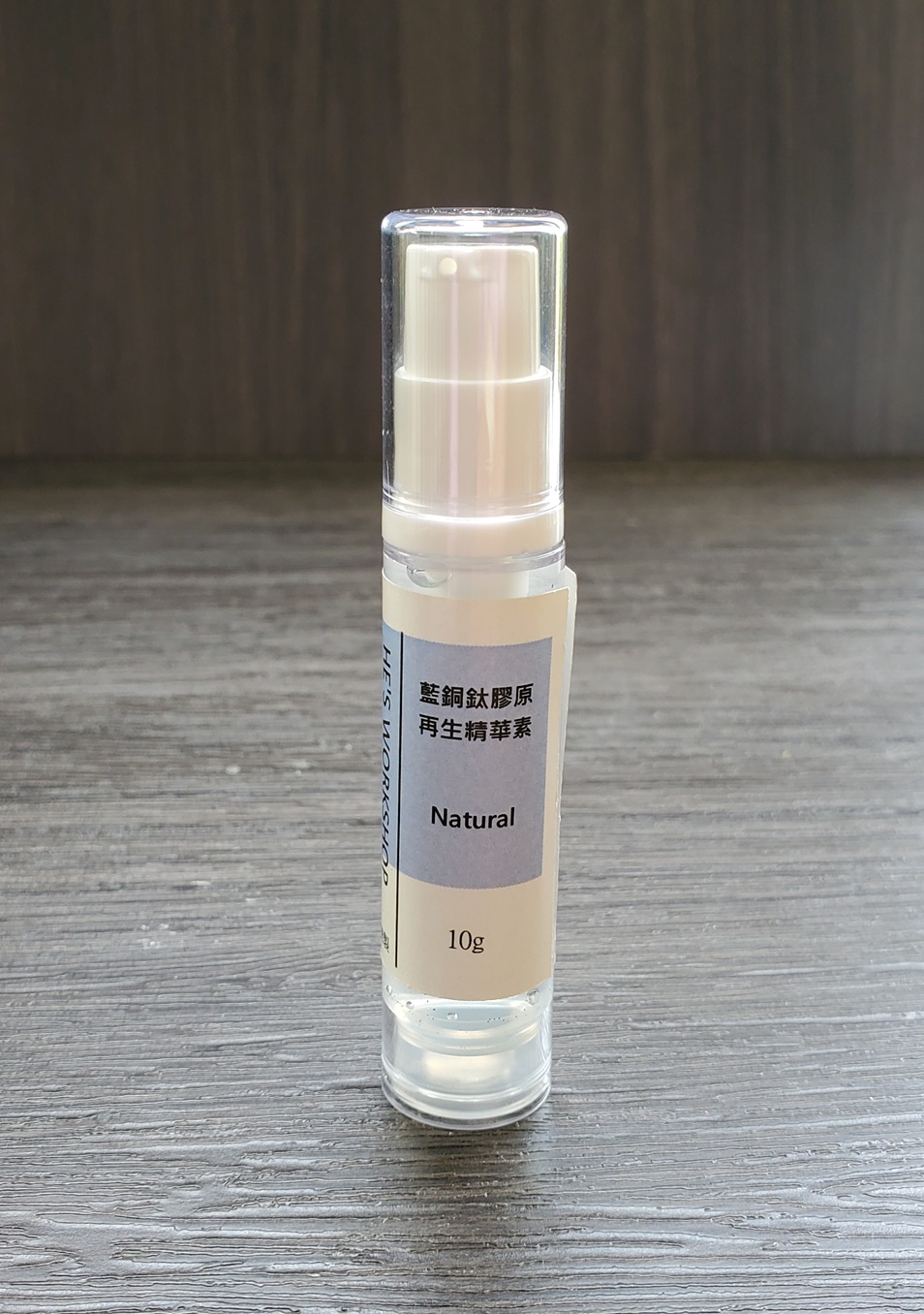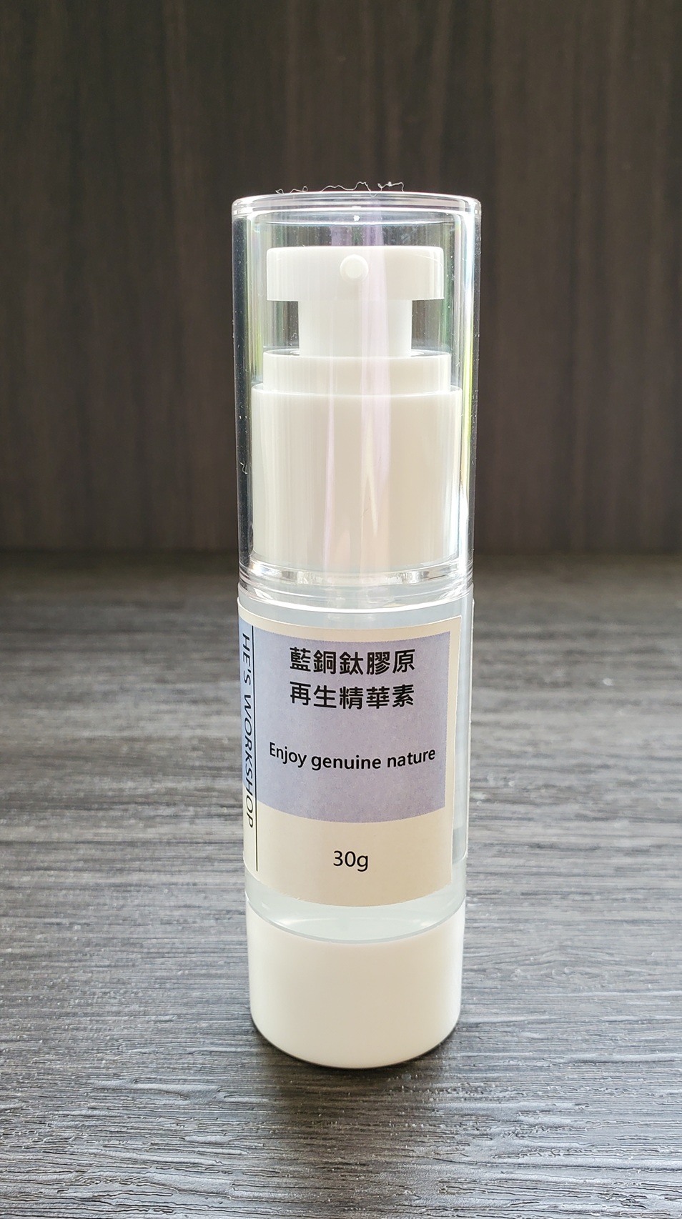 藍銅鈦膠原再生精華素 10g/30g (不含人工化學添加劑 成份天然 可安心使用) ✨ 藍銅胜肽原液 ✔  促進膠原蛋白再生:研究顯示,藍銅胜肽比維生素C或A酸更有效刺激膠原蛋白生成 ✔  修復肌膚:能促進傷口癒合,修復受損的肌膚屏障,減少疤痕和暗瘡印 ✔  改善肌膚彈性:增加皮膚上皮組織再生,減少粗細皺紋,改善肌膚彈性 ✔  抗氧化:抵禦自由基對肌膚的侵害,延緩皮膚老化 ✔  抗發炎:減少炎症反應,適合敏感肌膚使用 ✔  改善膚色不均:使肌膚更均勻透亮 ✔  減少毛孔粗大:使肌膚更光滑細緻 ✔  提升肌膚光澤度:使肌膚更健康有活力 ❤️ 提高護膚品吸收力:幫助其他活性成分更好地滲透到肌膚底層,提高整體護膚效果 ✨ 五合一透明質酸液 ✔ 通過不同分子大小的透明質酸,能深入滲透到皮膚各層,達到補水、鎖水、修復 ✔ 深層保濕、增加皮膚彈性、減少皺紋、促進細胞修復和增強皮膚屏障 ✔ 通過補水和增加彈性,透明質酸可以有效減少細紋和皺紋的出現 ✨ 維他命B5 ✔ 安撫肌膚不適,舒緩泛紅、乾癢、刺激感 ✔ 增加角質層含水量,減少水分流失,使皮膚柔軟潤澤 ✔ 修復肌膚屏障,提升肌膚的自我修護能力 ✨ 植物甘油 ✔ 強效保濕:深層滋潤肌膚,使皮膚保持水潤 ✔ 強化肌膚屏障:修護和強化皮膚的天然屏障,防止水分流失,並抵禦外部刺激物,使肌膚更健康 ✔ 緩解乾燥不適:能有效舒緩乾燥、粗糙、緊繃和脫皮等現象,並減輕搔癢感 ✔ 提升肌膚柔軟度與彈性:讓皮膚變得水潤、柔亮,同時增加柔軟度和彈性 成份 : 藍銅胜肽原液 五合一透明質酸液 維他命B5 純露 植物甘油 抗菌劑 使用方法 : 早晚潔面後,取用2-3滴塗抹全面至吸收,下一步,可以配合面霜使用。